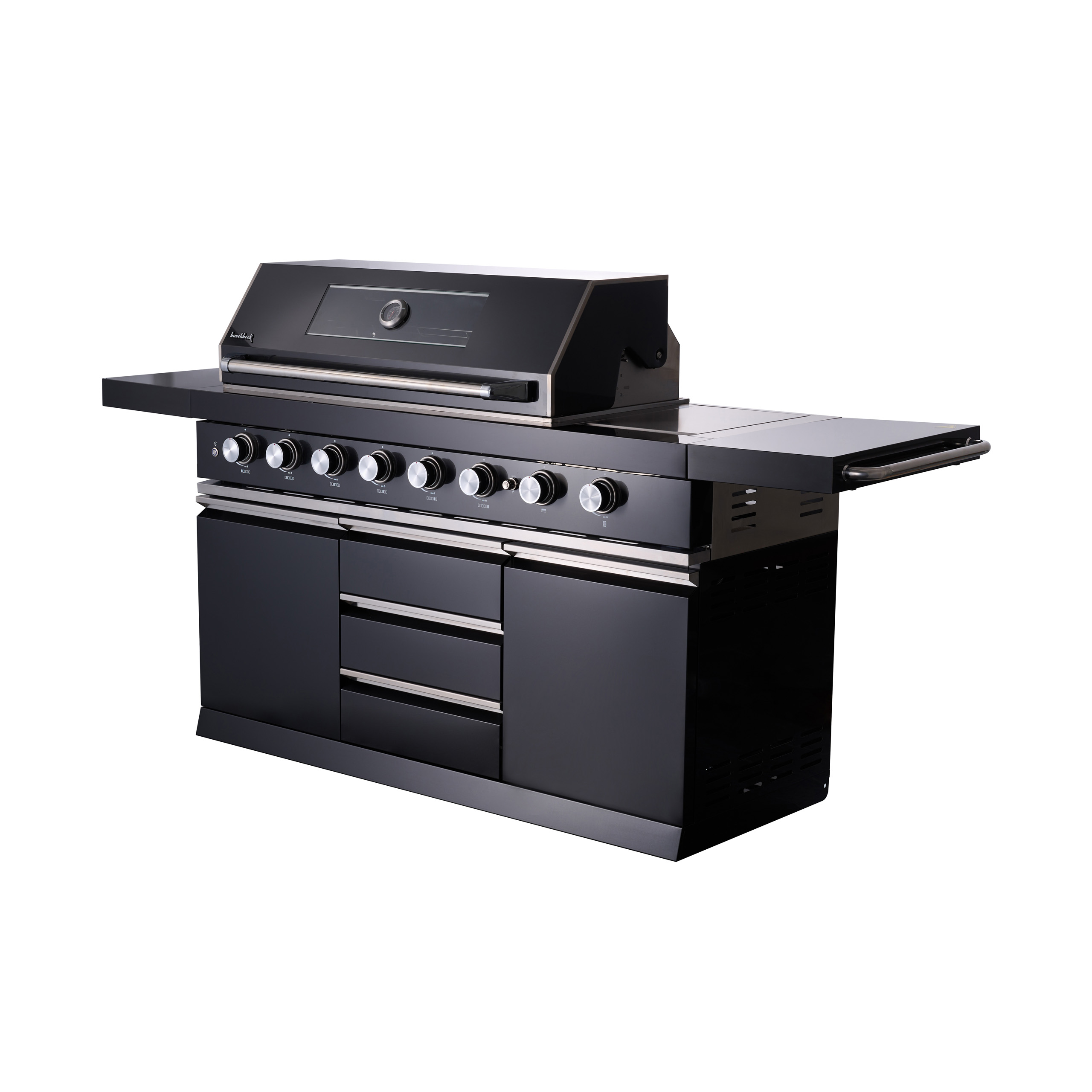 Unterschränke und Schubladen bieten ausreichend Stauraum für Grillzubehör und Utensilien. Drehknöpfe mit LED-Beleuchtung erhöhen den Bedienkomfort. Die Outdoorküche ist für Propan- und Butangas geeignet; Gasflaschen bis Ø 31 x H 49,5 cm können im Unterschrank während des Betriebs verwendet werden (nicht im Lieferumfang enthalten). Anschlussschlauch und Gasdruckregler sind im Lieferumfang enthalten. Arbeitshöhe ca. 90 cm, Breite mit abgeklappten Ablagen ca. 163 cm.