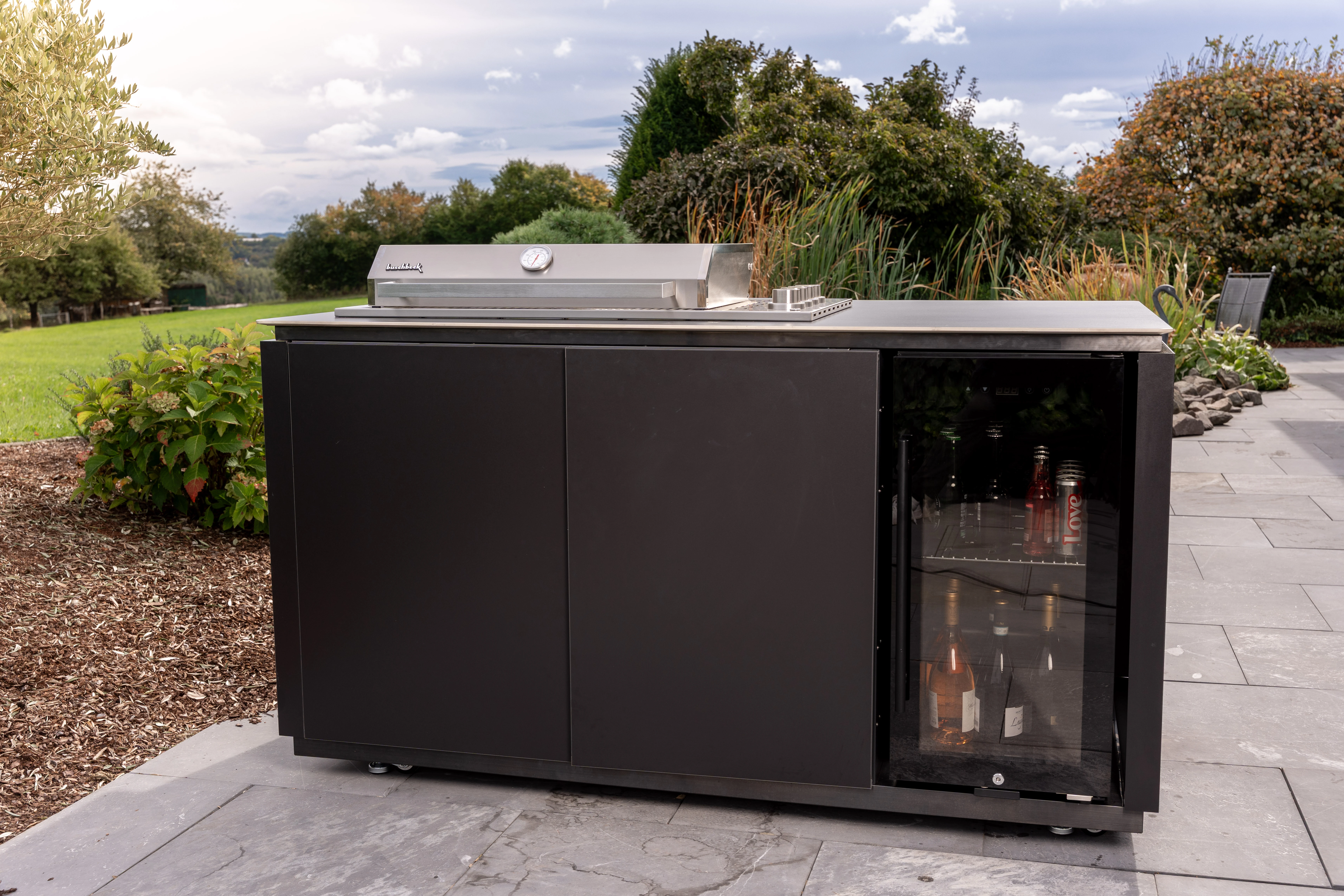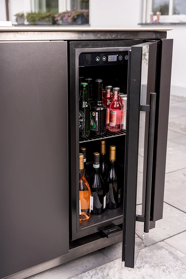 Ein großer Einbaukühlschrank aus Edelstahl hält Getränke und Grillgut jederzeit gut gekühlt und schnell griffbereit. Zusätzlichen Stauraum bieten Schränke mit Softclose-Türen, in denen Grillzubehör und Geschirr verstaut werden können.