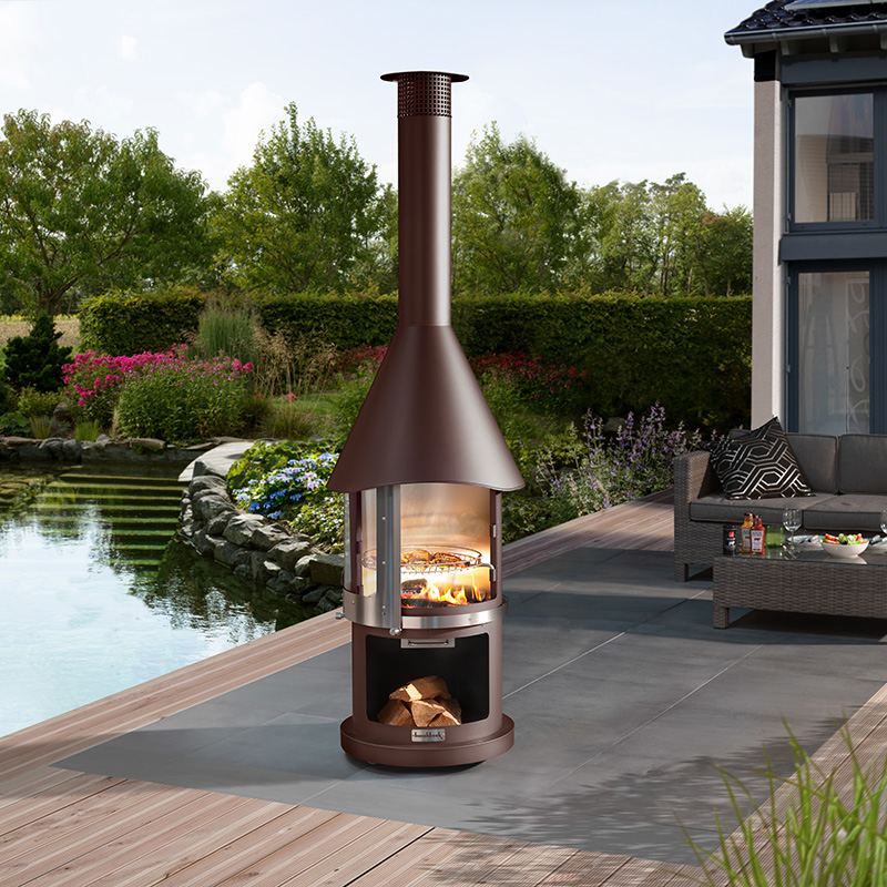 Die seitlich verschiebbare Glasschiebetür ist das Highlight dieses Edelstahlgrillkamins in braun metallic: Sie schützt zuverlässig vor Wind und Ascheflug und bietet gleichzeitig freie Sicht auf das Feuer. Der Korpus ist – außer in der Variante Edelstahl gebürstet – mit hitze- und wetterbeständigem Senothermlack beschichtet. Rostfreier Edelstahl und bis 1.000 °C hitzebeständige Feuerbetonplatten im Brennraumboden gewährleisten langlebige Qualität. Der doppelwandige Brennraum strahlt die Wärme gezielt nach vorne ab, und das Stecksystem reduziert Schweißnähte sowie potenzielle Korrosionsflächen. Vier Gummirollen erleichtern den Standortwechsel.