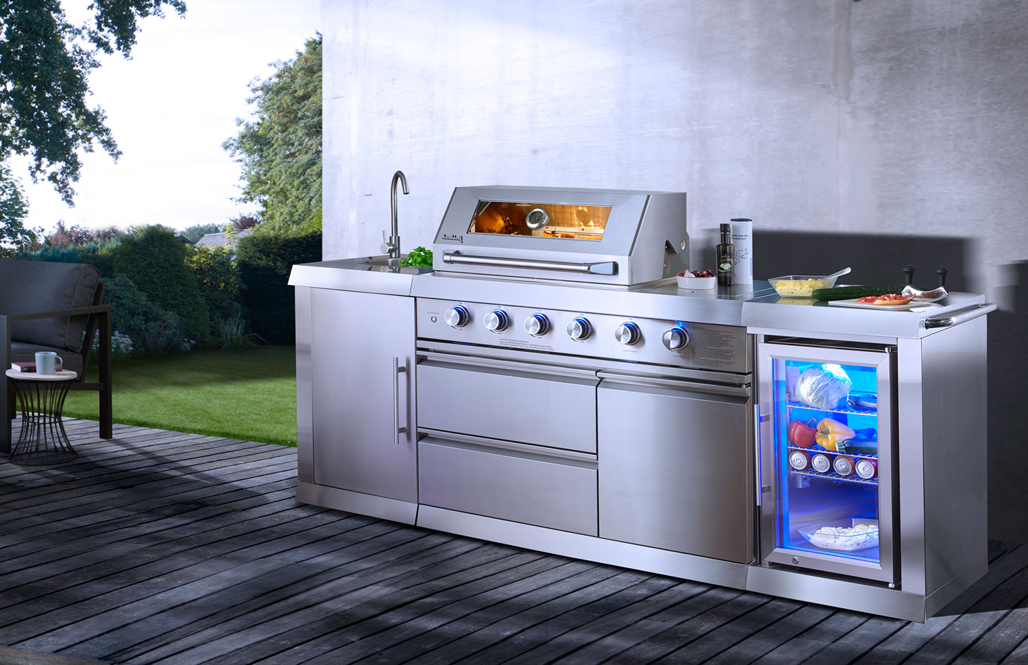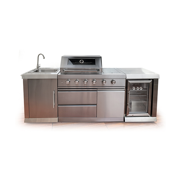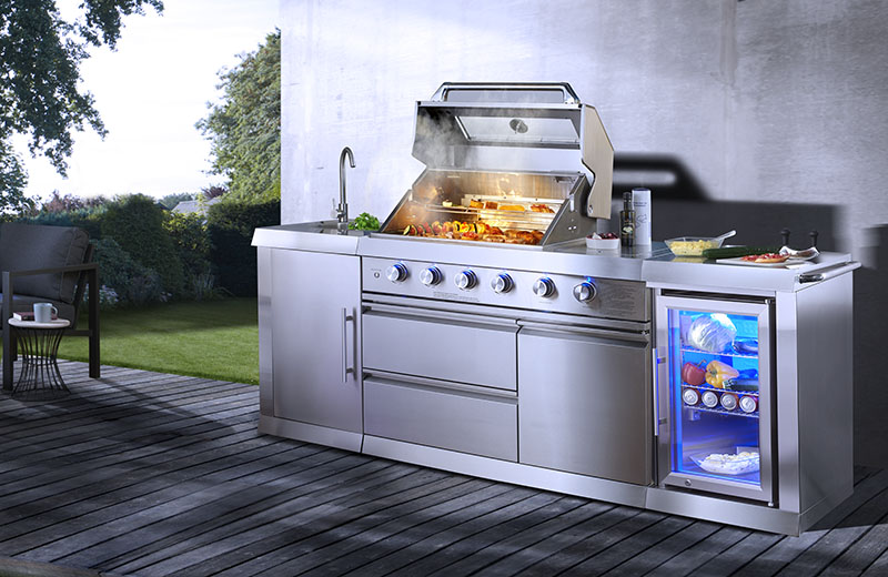 Die Outdoorküche Oxford kombiniert hochwertigen Edelstahl mit einer komfortablen Ausstattung für vielseitiges Grillen im Außenbereich. Vier stufenlos regulierbare Hauptbrenner (je 3,9 kW) sowie ein Heckbrenner (4,2 kW) ermöglichen direktes und indirektes Grillen. Die seitliche Sizzle Zone mit 4,3 kW erzeugt hohe Hitze für exzellentes Branding und eine aromatische Rösttextur bei Fleisch, Fisch und Gemüse.