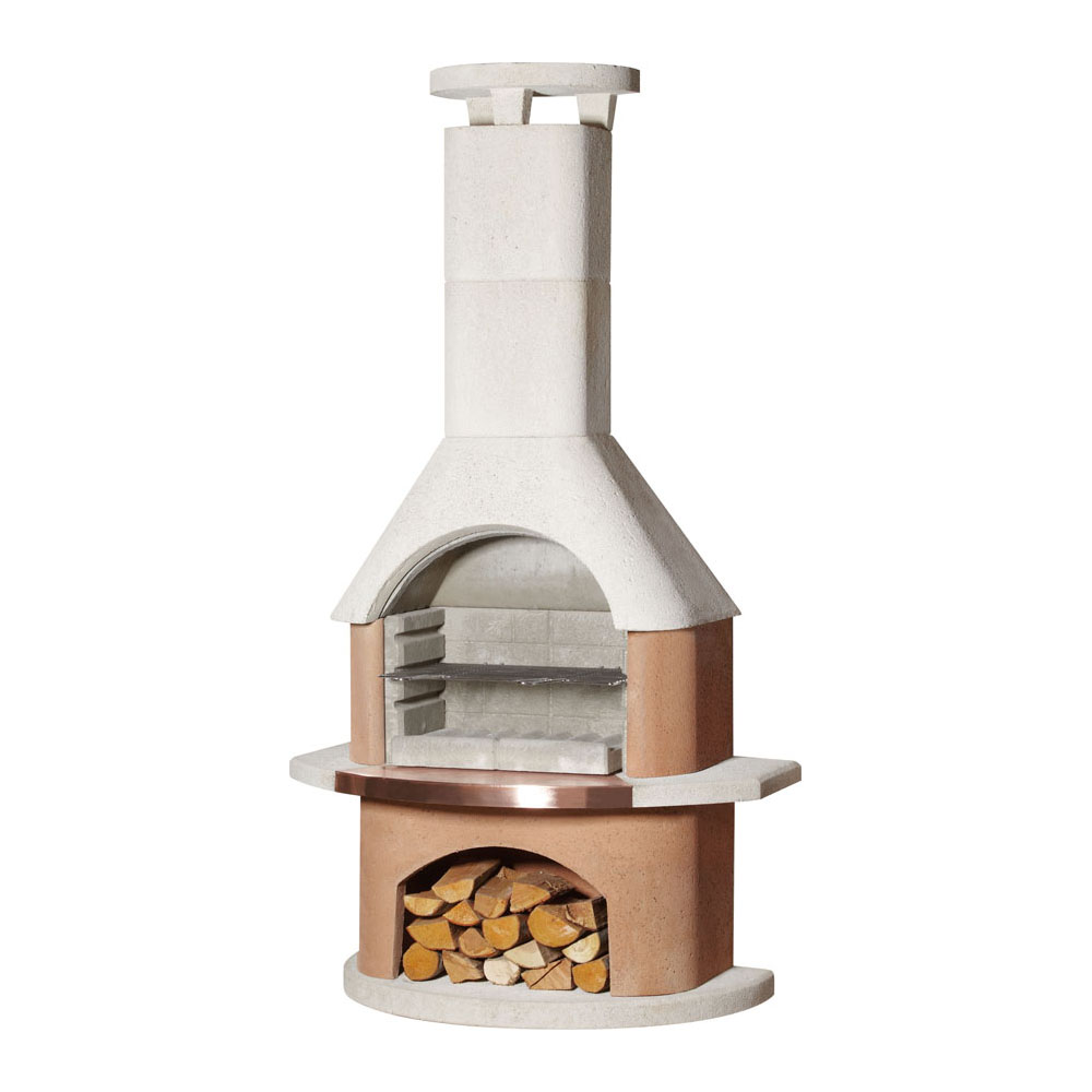Dieser Gartengrillkamin ist ein echtes Schmuckstück für den Garten. Feuerraum und Holzfachverkleidung bestehen aus terrakottafarbenem Stahlbeton und setzen einen deutlichen Kontrast zur edlen weißen Oberfläche der übrigen Bauteile. Eine Kupferblende vor der Feuerstelle rundet das Design ab. Der Kamin eignet sich für Holzkohle ebenso wie für Holz und ist TÜV- und GS-zertifiziert. Die Lieferung umfasst Aufbauanleitung, Grillrost und Ansatzkleber.