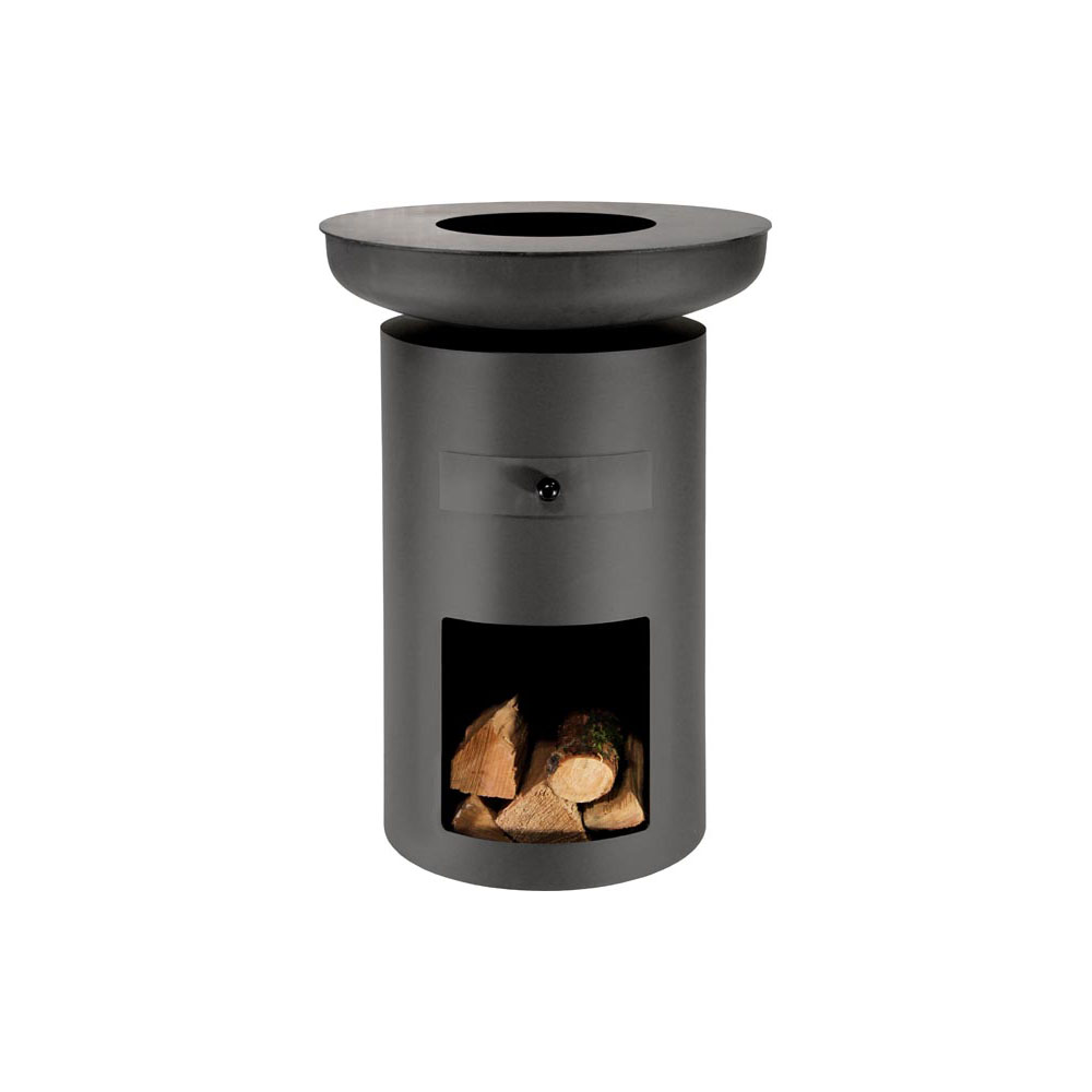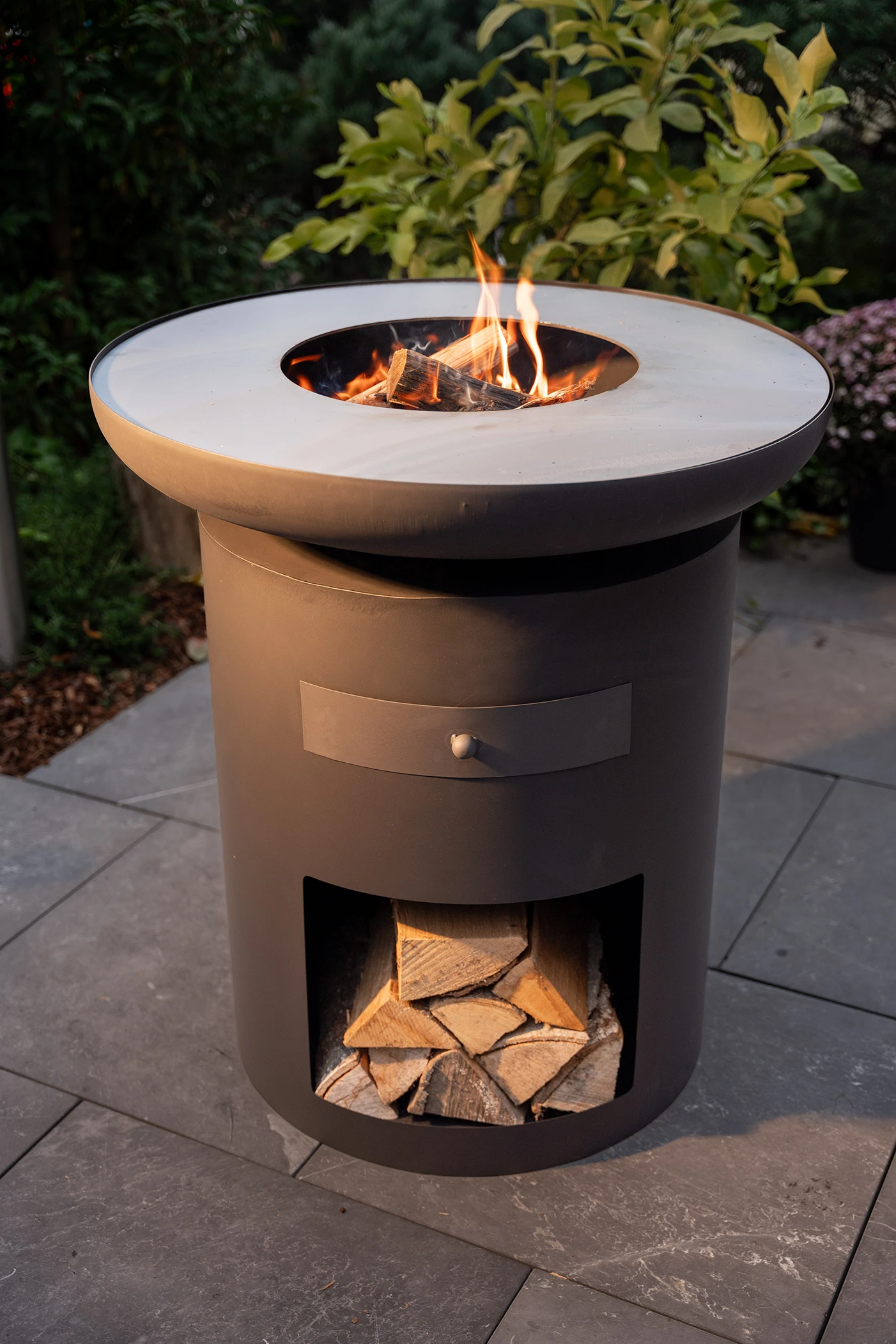 Dieser robuste Plancha-Grill vereint Grillfunktion und Lagerfeuerambiente in einem Gerät. Der abnehmbare Grillring aus 4 mm starkem Stahl bietet unterschiedliche Wärmezonen – ideal für Fleisch, Scampi oder Gemüse. Asche fällt sauber in den entnehmbaren Aschekasten, und im integrierten Holzfach ist ausreichend Platz für Nachschub. Das hohe Eigengewicht sorgt für eine stabile Standfestigkeit.