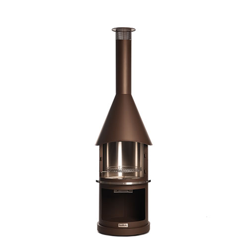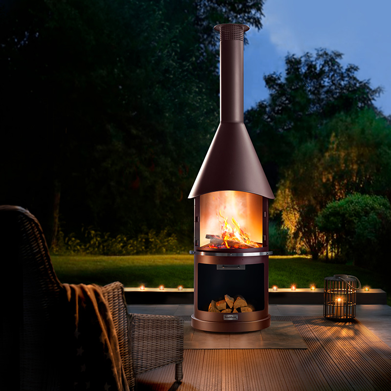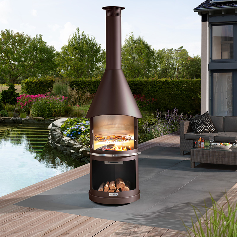 Der Edelstahlkamin Sydney in braun-metallic bietet witterungsbeständige Qualität und komfortables Grillen in angenehmer Arbeitshöhe. Der vierfach höhenverstellbare Grillrost aus Edelstahl ist bereits enthalten. Der doppelwandige Brennraum mit Edelstahlverkleidung strahlt die Wärme gezielt nach vorne ab, während im Boden hitzebeständige Feuerbetonplatten (bis 1.000 °C) für zusätzliche Sicherheit sorgen. Dank Edelstahlreling und vier Gummirollen (zwei lenkbar, zwei feststehend) lässt sich der Kamin auch im Betrieb bequem ausrichten und verschieben.