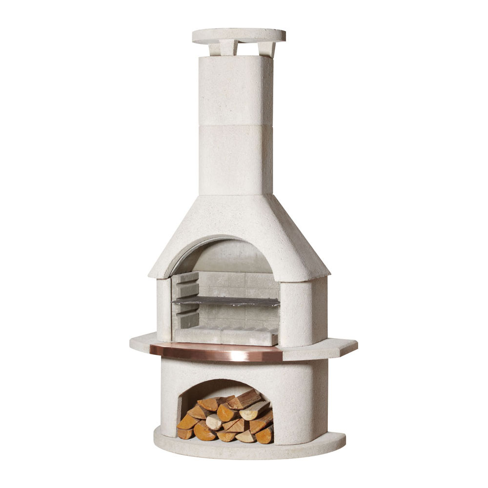 Ein eleganter Gartengrillkamin mit edler weißer Oberfläche, dessen dekorative Kupferblende vor der Feuerstelle ihm seine besondere Ausstrahlung verleiht. Er eignet sich sowohl für Holzkohle als auch für Holz. Der Aufbau ist unkompliziert, und nach 24 Stunden ist der Kamin betriebsbereit. Der Kamin ist TÜV- und GS-geprüft, die Lieferung erfolgt zerlegt und umfasst Aufbauanleitung, Grillrost und Ansatzkleber.